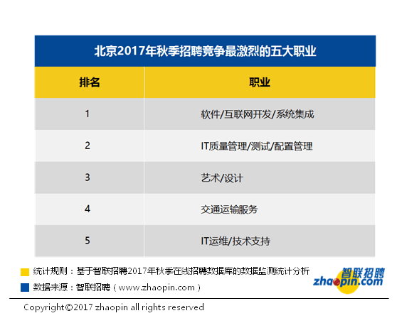 智聯招聘在線數據顯示,北京地區2017年秋季競爭最為激烈的職業是軟件/互聯網開發/系統集成、IT質量管理/測試/配置管理和藝術/設計。此外,交通運輸服務和IT運維/技術支持的競爭也較為激烈。軟件/互聯網開發/系統集成、IT質量管理/測試/配置管理等職位供應數量有限,所以求職競爭較為激烈。專業性極強的藝術/設計類職業就業人數不斷增加,使其競爭也較為激烈。