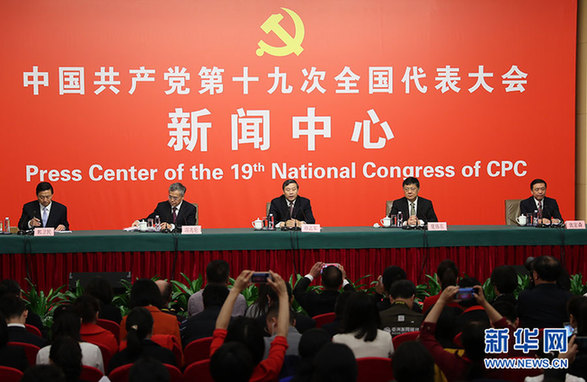 10月20日,十九大新聞中心舉行記者會,邀請中宣部、中央文明辦、文化部、新聞出版廣電總局相關負責人介紹加強思想道德和文化建設情況,並回答記者提問。圖為記者會現場。新華網 郝廣鵬 攝