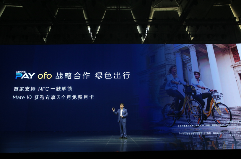 華為消費者業務CEO餘承東表示:“Huawei Pay和ofo的戰略合作,綠色出行,共享綠色生態未來,Huawei Pay首家支持ofo小黃車NFC一觸解鎖。“