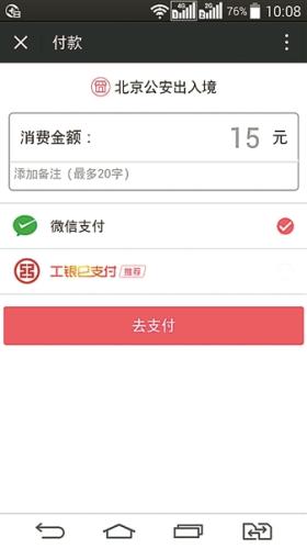 北京市公安局出入境管理局有關負責人表示,在試運行微信掃碼支付方式期間,共有1.5萬餘名申請人體驗了微信掃碼支付帶來的便利。經過測試,在網絡良好的情況下,整個繳費過程不超過10秒鐘。申請人需要繳費收據的,可在使用微信掃碼支付後,前往人工收費窗口領取。