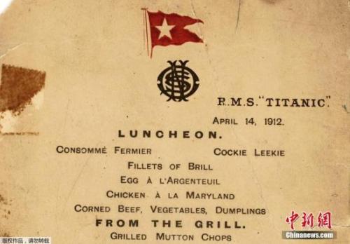 資料圖:當地時間8月31日消息,紐約一拍賣公司公佈,9月30日將拍賣一份泰坦尼克號上“最後的午餐”菜單。這份菜單由一位通過救生艇逃生的乘客帶出,拍品估價5萬至7萬美元。