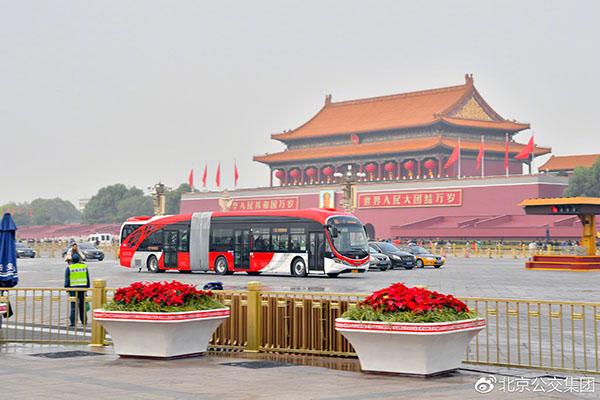 10月22日上午,首批10部以“中國紅”為外觀主題的18米純電動公交車投入1路運營,為長安街再添一道靚麗風景。1路此次啓用的純電動通道車選用仿生海豚造型,採用低地板、大容量、寬通道的車輛結構設計,並率先配置了PM2.5自動過濾淨化系統和360度主動安全預警系統,沿線市民的公交出行將更加安全、舒適。