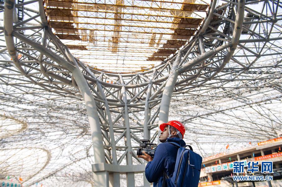 10月16日,南蘇丹廣播集團記者阿湯加在北京新機場建設工地採訪拍攝。採訪新機場建設項目,是十九大新聞中心在大會開幕前組織的15條京津冀採訪線路之一。新華社記者 劉金海 攝