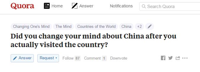 “當你真正來到中國之後,你對中國的看法變了嗎?”一名網友于5月末,在美國問答社區網站Quora上提出了這一問題。截至目前,該問題的頁面信息已經被超過32萬名網友瀏覽。