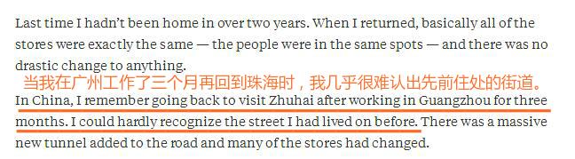 同Larry有着相同的感受,William表示,時隔兩年回到美國的家鄉,他發現所有的商店都還是老樣子,沒有什麼太大的變化。“但是,在中國,我還記得,當我在廣州工作了三個月再回到珠海時,我幾乎很難辨認出先前住處的街道。”