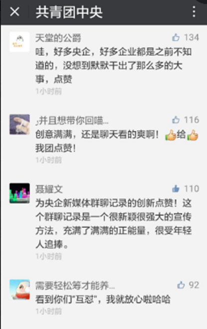 “‘央企新媒體羣聊記錄’刷屏是央企新媒體親民傳播風格的正向反饋,能引發受眾共鳴的話題加上激發和感染的受眾,從而引發了積極的再傳播力量”,人民網輿情監測室常務副秘書長單學剛同樣不諱受眾在其中的作用。