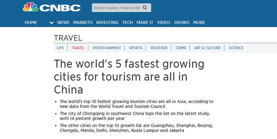 美媒:全球前五大旅遊業發展最快的城市全在中國