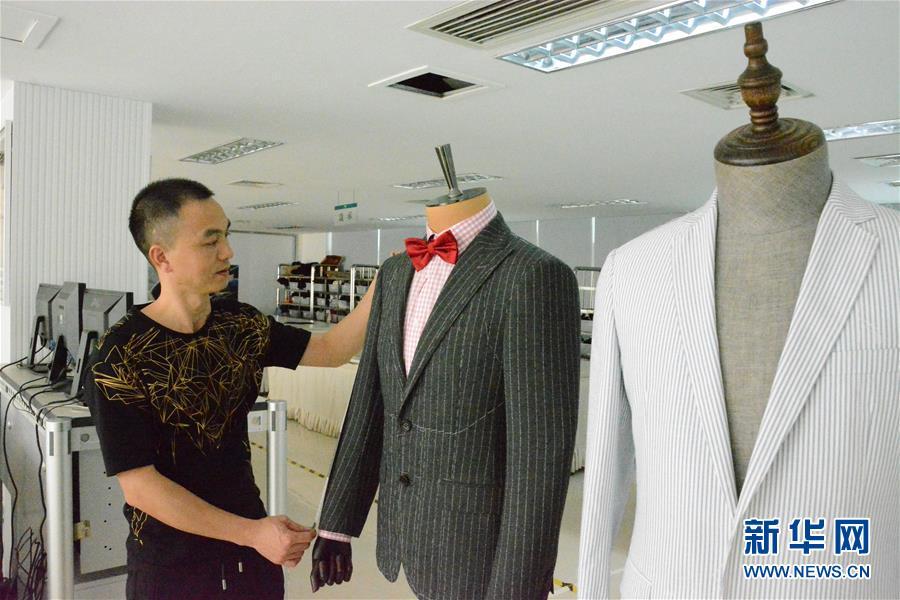 10月17日,在福建省七匹狼實業股份有限公司晉江生產基地技術中心,首席技能指導師胡牛崽檢查新的服裝版型。新華社記者 黃鵬飛 攝