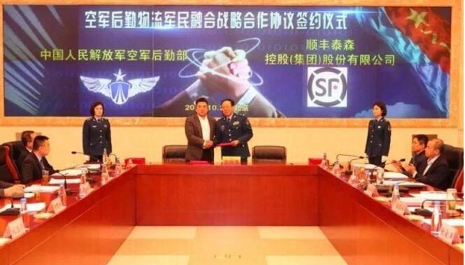 【環球網軍事報道】10月25日,順豐集團官方微信公眾號披露,23日,其與中國人民解放軍空軍後勤部在京簽署戰略合作協議,就空軍後勤軍民融合軍事物流體系建設開展長期合作,並獲頒發“空軍後勤物流軍民融合戰略合作單位”資質牌。同一天,京東集團相關人士確認,京東物流也與空軍後勤部達成“物流軍民融合”戰略合作,同樣獲得“空軍後勤物流軍民融合戰略合作單位”資質牌。