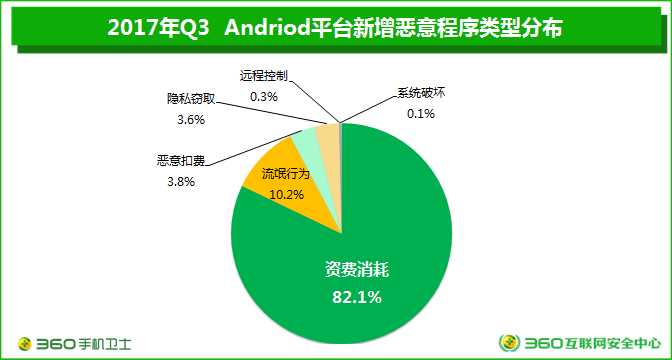惡意軟件的危害性到底有多大?根據2017年3月360手機衞士發佈的《2016年安卓惡意軟件專題報告》,2016年360手機衞士累計截獲安卓平台新增惡意程序樣本1403.3萬個,平均每天新增3.8萬。到了2017年,情況仍然不容樂觀,根據360手機衞士發佈的《2017年Q3中國手機安全狀況報告》顯示,今年第三季度,360互聯網安全中心共截獲安卓平台新增惡意程序樣本188.1萬個,平均每天新增2.1萬,其中隱私竊取佔比3.6%。雖然惡意程序新增量同比有所下降,但感染規模依然龐大,7-9月,安卓平台用户累計感染惡意程序5110萬人次,平均每天感染量達56.8萬人次,其中8月感染量達到峯值1812.4萬人次。