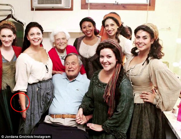 老布什的發言人麥格拉夫説,坐在輪椅上的老布什與他人合照時,手臂通常會放在對方的腰部下方。他還説,老布什經常説同樣的笑話讓對方放鬆心情,偶爾也會拍一拍女性的後方,但並非惡意行為。