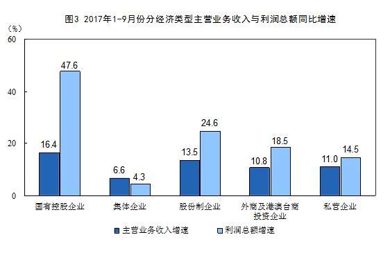 1-9月份,規模以上工業企業中,國有控股企業實現利潤總額12577.4億元,同比增長47.6%;集體企業實現利潤總額323.4億元,增長4.3%;股份制企業實現利潤總額39096.7億元,增長24.6%;外商及港澳台商投資企業實現利潤總額13514.3億元,增長18.5%;私營企業實現利潤總額18285.9億元,增長14.5%。