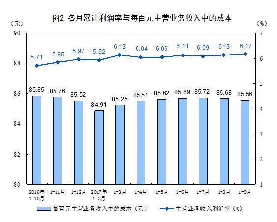 1-9月份,規模以上工業企業實現主營業務收入90.5萬億元,同比增長12.5%;發生主營業務成本77.4萬億元,增長12.2%;主營業務收入利潤率為6.17%,同比提高0.51個百分點。
