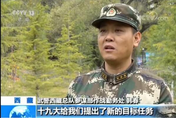 *武警西藏總隊參謀部作戰勤務處 韓春:*十九大給我們提出了新的目標任務,在新時代,作為守衞祖國邊疆的武警官兵,按照習主席講的那樣,一定要有新氣象新作為,始終紮根高原、立足崗位,為實現強軍目標作出積極貢獻。