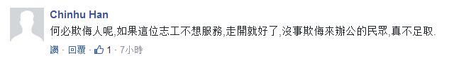 事件隨後引起台網友的憤怒。網友紛紛表示批評“何必欺侮人呢,如果這位志工不想服務,走開就好了,沒事欺侮來辦公的民眾,真不足取。”“志公也玩官威 !”、“那老頭就是丟臉的井蛙 ”!