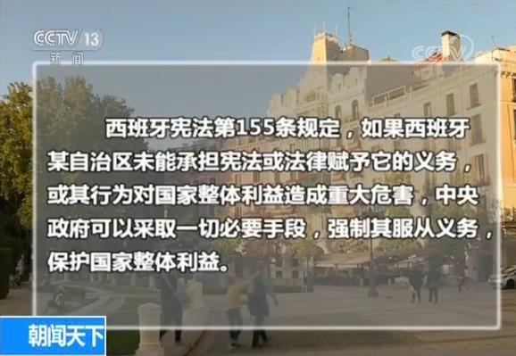 西班牙憲法第155條規定,如果西班牙某自治區未能承擔憲法或法律賦予它的義務,或其行為對國家整體利益造成重大危害,中央政府可以採取一切必要手段,強制其服從義務,保護國家整體利益。