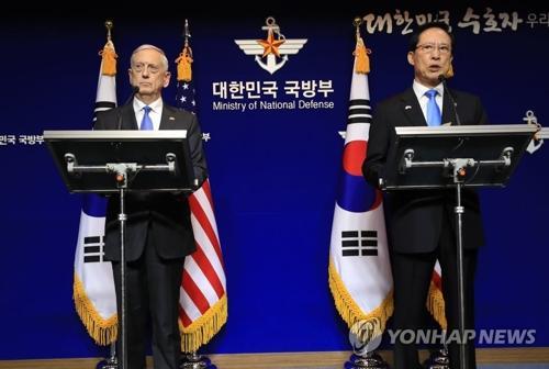10月28日,第49屆韓美安保會議在首爾國防部大樓舉行。韓國防長宋永武(右)和美國國防部長馬蒂斯會後舉行共同記者會。(圖片來源:韓聯社)