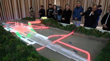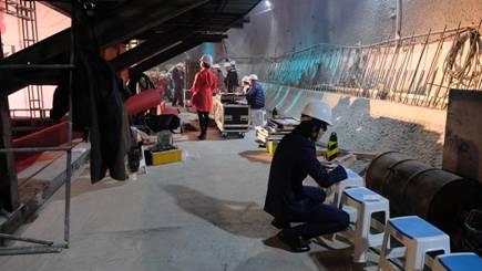 一位工地負責人站在舞台幕布背後介紹説,這個“穹頂”區斷面跨度32.7m,高度19.5米,整個面積比一個籃球場還大,是國內單拱跨度最大的一段暗挖隧道。未來,三股並列火車道將在這裏融合為一股火車道。工人手電筒燈光指向的入口,就是三股火車道匯入的地方。