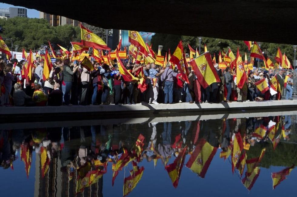 當地時間28日,數以千計西班牙民眾在西班牙首都馬德里市中心發起遊行,高喊“把普伊格德蒙特關起來”。(圖片來源:美聯社)
