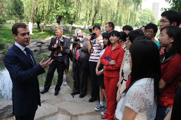梅德韋傑夫曾多次到訪中國,自稱是中國的“常客”。在與中國媒體和網友的交流中,我們瞭解到,這位大國總理對中國道家思想情有獨鍾,還酷愛飲用烏龍茶,喜歡中國電影,曾號召俄羅斯人多學學中文。