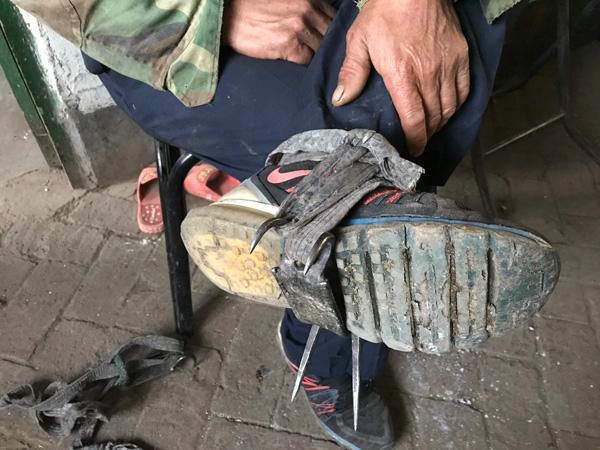 腳扎子是一種綁在腳上的鐵製工具,上面有尖鋭的釘子用於扎進樹皮,讓人踩着攀爬上樹。爬到十幾米處,打塔人踩到樹枝上,一手把着樹幹一手解開綁在身後的長杆。長杆頂端綁了一個鐵鈎,用於搖晃枝頭,擊落松塔。