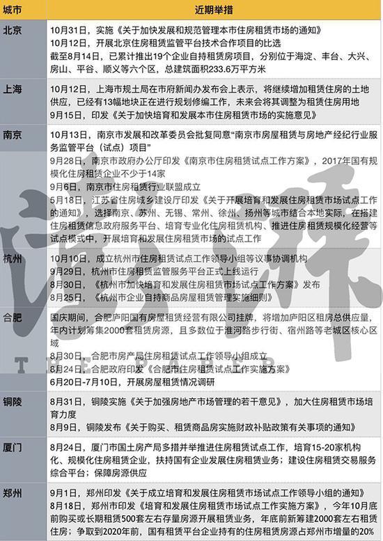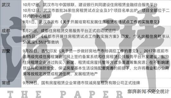 如四川省政府2016年10月25日發佈《關於加快培育和發展住房租賃市場的實施意見》,提出到2020年,全省基本形成以市場配置為主、政府提供基本保障的住房租賃體系。安徽省政府在2016年11月下發《關於加快培育和發展住房租賃市場的通知》,提出公積金可以支付房租,培育一批租賃機構等舉措。
