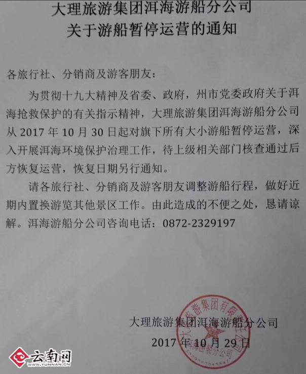 隨後,大理旅遊集團有限責任公司遊船分公司王副經理向雲南網(微信公號:yunnancn )證實了上述通知的真實性。