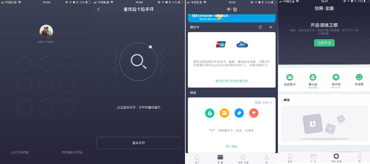 對於此前沒有手環使用習慣的用户來講,拉卡拉手環的初次使用是沒有任何操作門檻的。下載拉卡拉手環官方APP,進而搜索手環進行配對,登錄賬號後首頁就是手環檢測到的運動和睡眠數據,卡包頁面顯示一卡通和銀聯錢包以及各種優惠券。對於首次激活的一卡通,拉卡拉手環是收任何費用的。拉卡拉將信用卡還款、賺錢、借錢、充話費等服務也整合進APP頁面,為個人用户提供多種金融增值服務,讓賺錢更容易,還款更便捷。