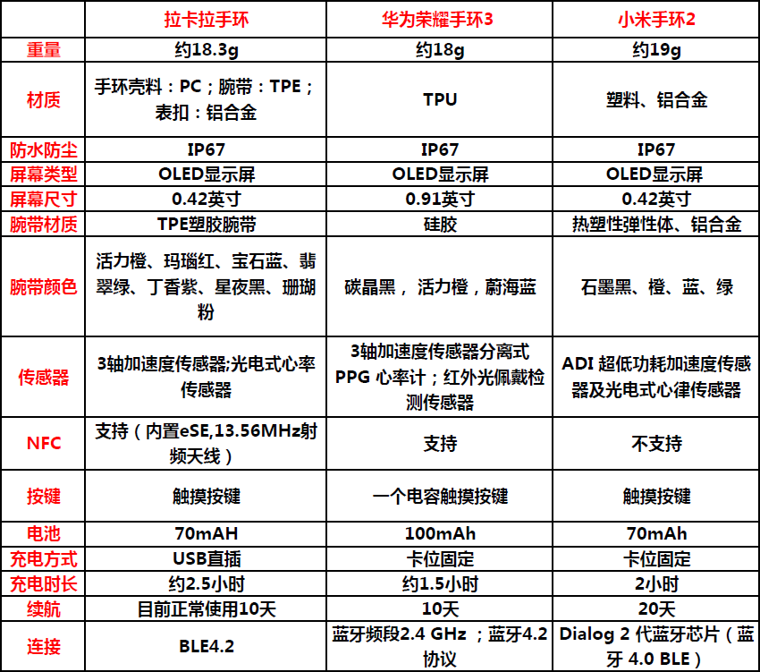 細數2017的手環市場,功能比較全面、體驗比較好的手環要數拉卡拉跨界手環、榮耀手環3 NFC版和小米手環2了。通過橫向對比,各自優勢一目瞭然。