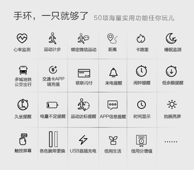 雖説小米手環2是不具備NFC功能,但其出貨量極大,吃掉了手環市場的一大塊蛋糕,肯定必有其過人之處。我們可以簡單看一看這三款手環的功能,在瞭解的同時也可以做一個對比,便於購買選擇。