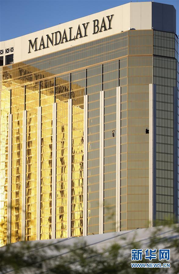 資料圖:這是10月3日拍攝的美國拉斯維加斯曼德勒海灣酒店,槍手所在房間破損的兩扇窗子清晰可見。拉斯維加斯當地時間1日晚發生嚴重槍擊事件,造成數百人死傷。新華網記者王迎攝