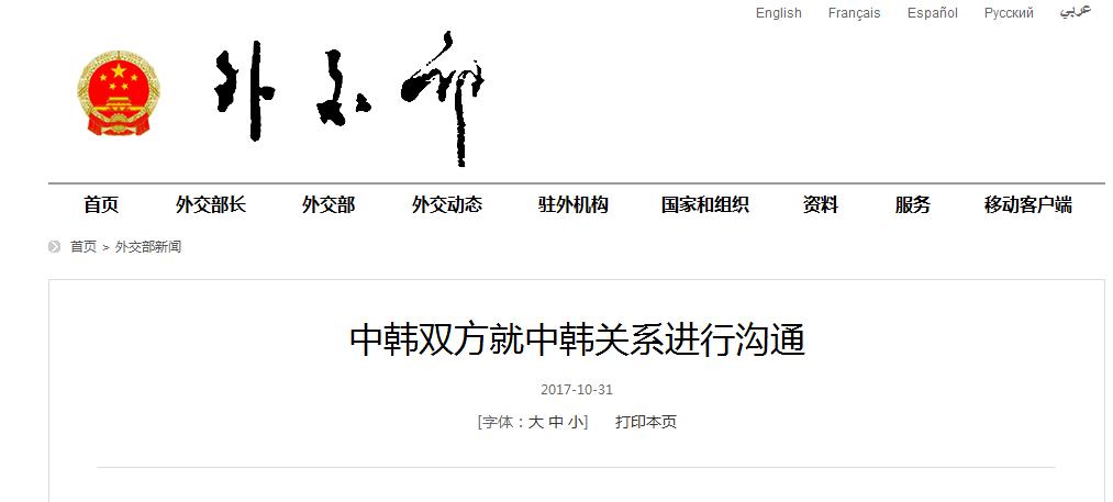 【環球網綜合報道】中國外交部網站10月31日消息稱,中韓雙方日前通過中國外交部部長助理孔鉉佑同韓國國家安保室第二次長南官杓之間的渠道等,就朝鮮半島問題等進行了外交部門間溝通。