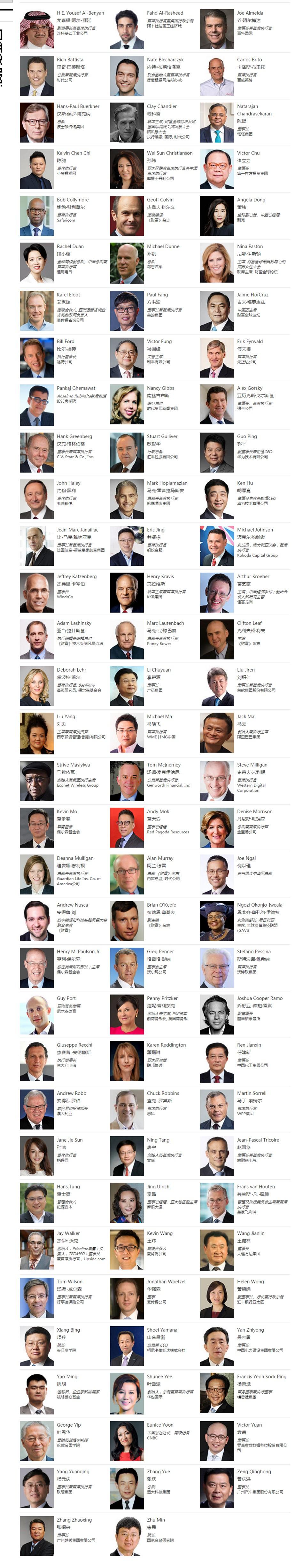 據介紹,擬出席的嘉賓包括阿里巴巴集團創始人兼董事局主席馬雲 ,騰訊聯合創始人、董事長兼首席執行官馬化騰 ,聯想集團董事長兼首席執行官楊元慶 ,富士康科技集團創始人兼首席執行官郭台銘 、北京大學國家發展研究院名譽院長林毅夫 。