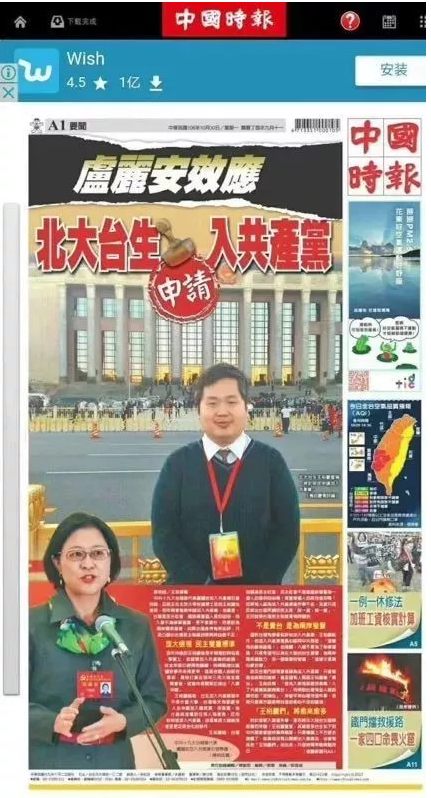 近日台灣《中國時報》在頭版頭條刊登了北大台生王裕慶申請加入共產黨的報道,並稱這是“盧麗安效應” 。