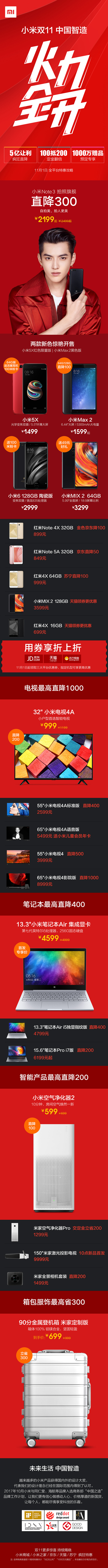 除了全平台戰略之外,在產品方面,小米也做足了“火力全開”的準備。從11月1日開始,已經宣佈雙11期間特惠300元的拍照旗艦手機小米Note 3將以2199元的震撼價格開售。另有兩大新色驚豔開售:變焦雙攝小米5X紅色限量版,價格1499元起;大屏手機小米MAX 2黑色版,將以特惠價1599元起開售。