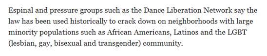 據悉,歷史上“禁舞令”是被用來打壓少數族裔人口眾多社區的工具,這些社區包括非裔美國人和拉丁裔美國人社區,以及同性戀、雙性戀及變性者社區。