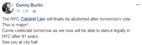 Donny Burlin:“紐約”禁舞令終於將在明天的公投被廢除。這太重要了!我們終於能在91年後合法地跳舞了,明天一起來慶祝吧。市政廳見!