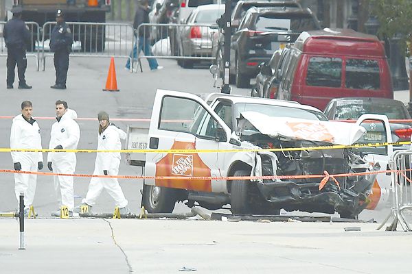 【環球時報綜合報道】“恐怖主義再次襲擊美國心臟!”美國最大城市紐約的核心區域10月31日遭遇恐怖襲擊:一名29歲的男子駕駛一輛皮卡車衝上一條擁擠的自行車道,導致8人死亡,11人受傷。與美國此前發生的多起汽車撞人事件不同,該事件很快被定性為恐怖襲擊,因為嫌犯在車內留的紙條宣佈效忠“伊斯蘭國”。