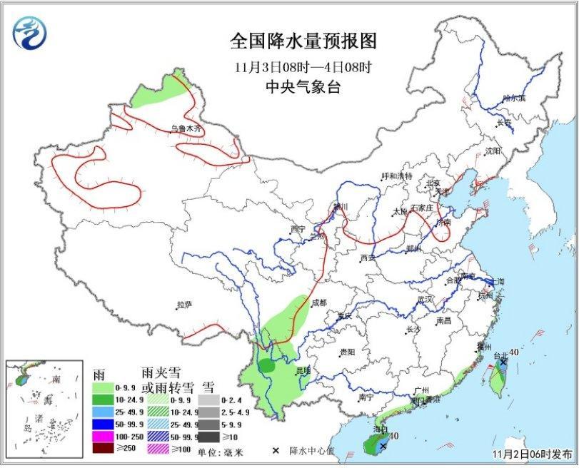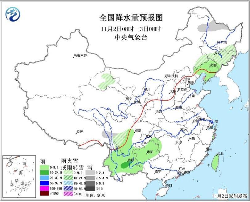 2日08時至3日08時,黑龍江西北部、內蒙古東部、吉林中東部等地的部分地區有小雪或雨夾雪;四川南部、雲南、貴州等地的部分地區有陣雨或小雨,局地有中雨(見圖1)。南海中部和南部海域將有7~8級、陣風9~10級的旋轉風,渤海、黃海、東海等海域將有6~7級、陣風8~9級的偏北風。