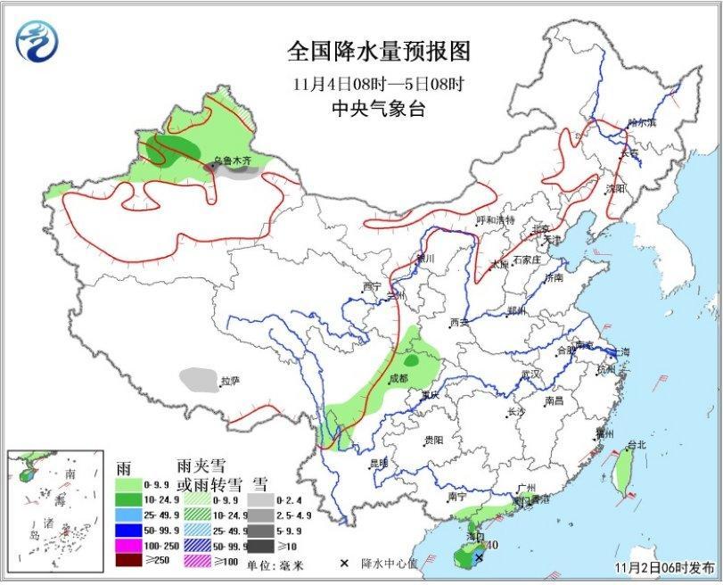 4日08時至5日08時,新疆北疆東南部地區、西藏中部等地的部分地區有小雪或中雪,局地大雪;新疆北疆大部、四川東部、川西高原南部、廣東和廣西南部沿海、海南島等地有小雨,局地有中雨或大雨。(見圖3)。東北地區北部、江淮東部、華南東部沿海等地有4~6級偏北風。
