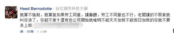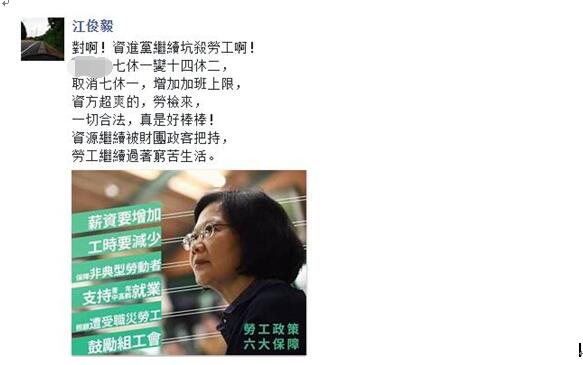 這裏再給各位講個知識點:在島內現行的“勞基法”中規定“勞工每七日中應有二日之休息,其中一日為例假,一日為休息日”,但未明説例假應該怎麼排,故而早期時有“七休一”函釋,即為兩例假應間隔6個工作日,但如徵得工會或勞工同意,例假可挪移,後因可連上12天班的“弊端”遭批;之後蔡英文當局上任,另以新“函釋”廢止舊“函釋”,又規定兩例假間最長就是6天,硬性規定了“一例一休”,但沒想到這次的“修法”卻又鬆綁了“七休一”……新黨新思維中心主任侯漢廷也在臉譜網怒斥稱:有關“一例一休”每一個修訂,都是越修越糟!