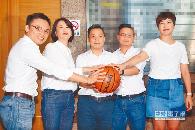 國民黨發言人1日亮相,文傳會義務副主委洪孟楷(左起)、台北市議員王鴻薇、文傳會主委李明賢、新媒體部主任黃健豪、新任文傳會副主委兼文宣部主任鍾沛君共同拿籃球,高喊“重返執政,國民黨加油”,希望2018地方選舉投“藍”成功。(圖片來源:台灣《中時電子報》)