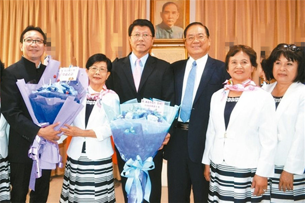 國民黨台南市黨部舉行新舊任主委交接典禮,黨員獻花祝福新主委謝龍介(右四)。(圖片來源:台灣《聯合報》)