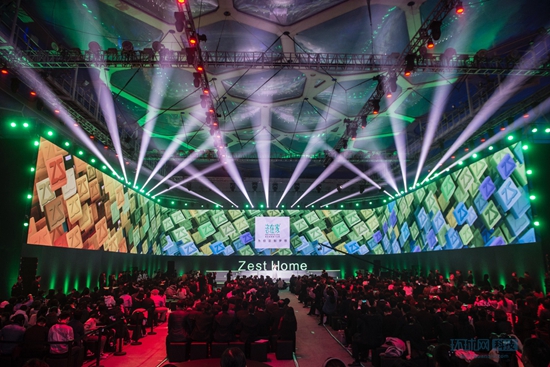 伴隨着曼妙的音樂聲,身穿綠色熒光服裝的舞者從觀眾後排曼妙出場,不停朝舞台方向跳動,凡所經過的區域都被燈光染成了綠色。慢慢地,舞台逐步點亮。舞者們化身為一個個精靈,與屏幕互動。從光線中裂變出新的空間,雙手向空中拋灑,舞台周圍泛起了彩色的燈光。而後一瞬間,全場黑下來開始倒計時,“ZEST HOME”的字體最終被華麗點亮。
