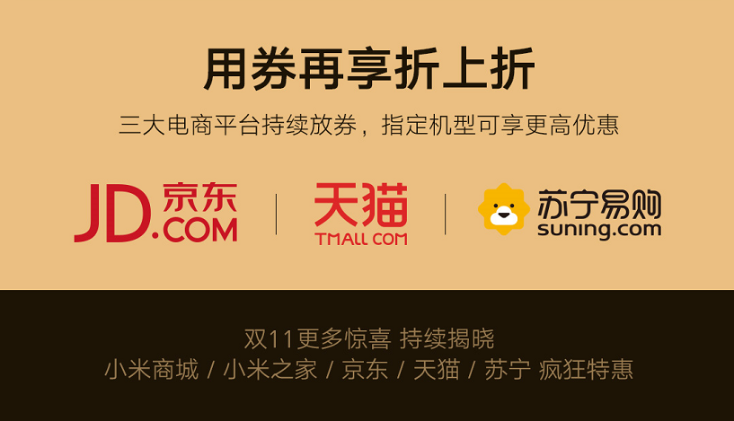 除此之外,小米6陶瓷尊享版從11月1日開始,開啓了2999元的現貨購買並送百元米粉卡的福利;作為全面屏2.0時代的開創者,小米MIX 2 的64GB版本購買就送49元好禮;紅米Note 4X 的32GB金色版在京東平台直降100,低至899元;紅米Note 5A的 32GB版在京東平台直降50,低至849元;紅米4X的 64GB版本在蘇寧平台直降100,僅999元。此外,用户還可以領取天貓、京東、蘇寧平台的優惠券,享受指定機型折上折。