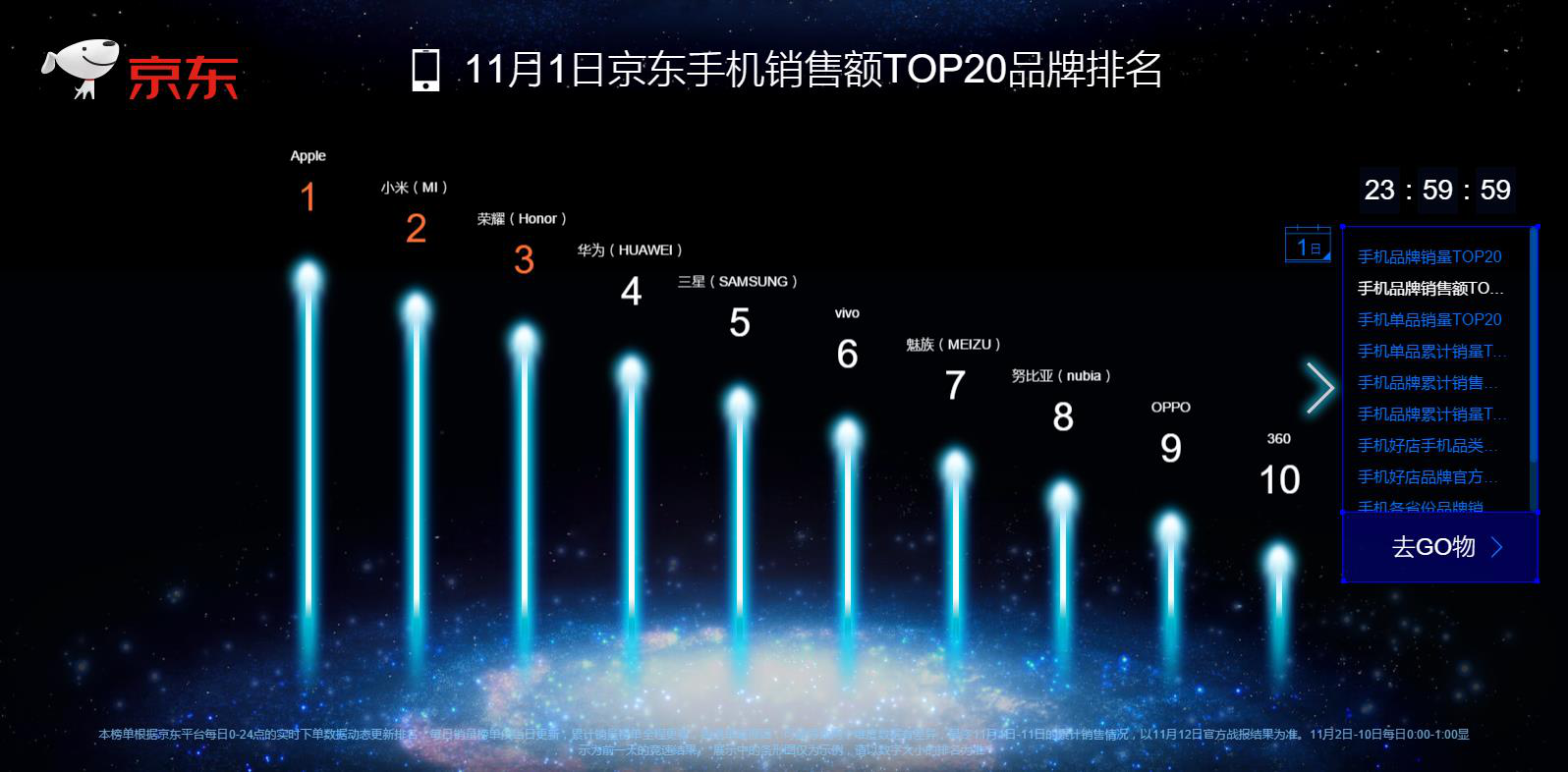 11月1日0點開始小米手機在京東商城和蘇寧易購上,就展現出銷量和銷售額一騎絕塵的實力。記者留意到早上8點30分京東手機即時競速排行榜上小米手機銷量排行第一、Apple排名第二,榮耀排名第三,銷售額排名也是三個品牌佔據了前三位的排名。而在晚間23點59分59秒最終戰果出爐後,小米手機堅持到了最後斬獲當天京東手機銷量品牌第一的榮譽、而當天京東手機銷售額排行榜上小米僅次於蘋果成為第二。而在蘇寧易購平台上小米手機同時斬獲了安卓手機總體銷售量和總體銷售金額雙第一的殊榮。兩大平台數據顯示,雙11小米手機首戰一騎絕塵喜迎開門紅,為本年度的雙11大戰開了個好頭。