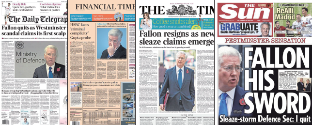 2日一大早面市的英國幾乎所有報章都在頭版刊登法倫辭職的新聞。英國《每日鏡報》形容法倫遭遇了 “性風暴”,令他不得不辭職,他也成為此輪英國政界性騷擾風波中第一位辭職的官員。“法倫的劍掉了”,英國《太陽報》挖苦稱,保守黨老將捲入了席捲威斯敏斯特的性騷擾醜聞。