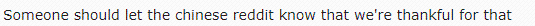 *但大陸觀眾的暖心舉動卻贏得了外國網友們的盛讚。*名叫TurbinePro的網友在著名的國外論壇Reddit上發帖記錄了這一幕: