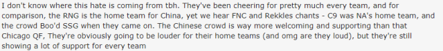 SulkyJoe: 我不知道對於中國觀眾的恨是哪裏來的。他們為每個隊伍喝彩。RNG戰隊是中國主場戰隊,但我們仍然能聽到為FNC戰隊和Rekkles的喝彩。作為對比,(在此前芝加哥進行的一項賽事中)C9戰隊是美國主場隊伍,觀眾們對對手韓國SSG戰隊發出了噓聲。中國觀眾顯然更加友好和熱情。他們對中國主場戰隊大聲吶喊,但也同樣對於每個隊伍展現了他們的支持。