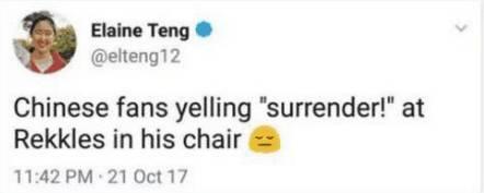 Elaine Teng在推文中寫道,當Rekkles還留在座位上時,中國觀眾高呼“投降”。 目前她已刪除這條推文。